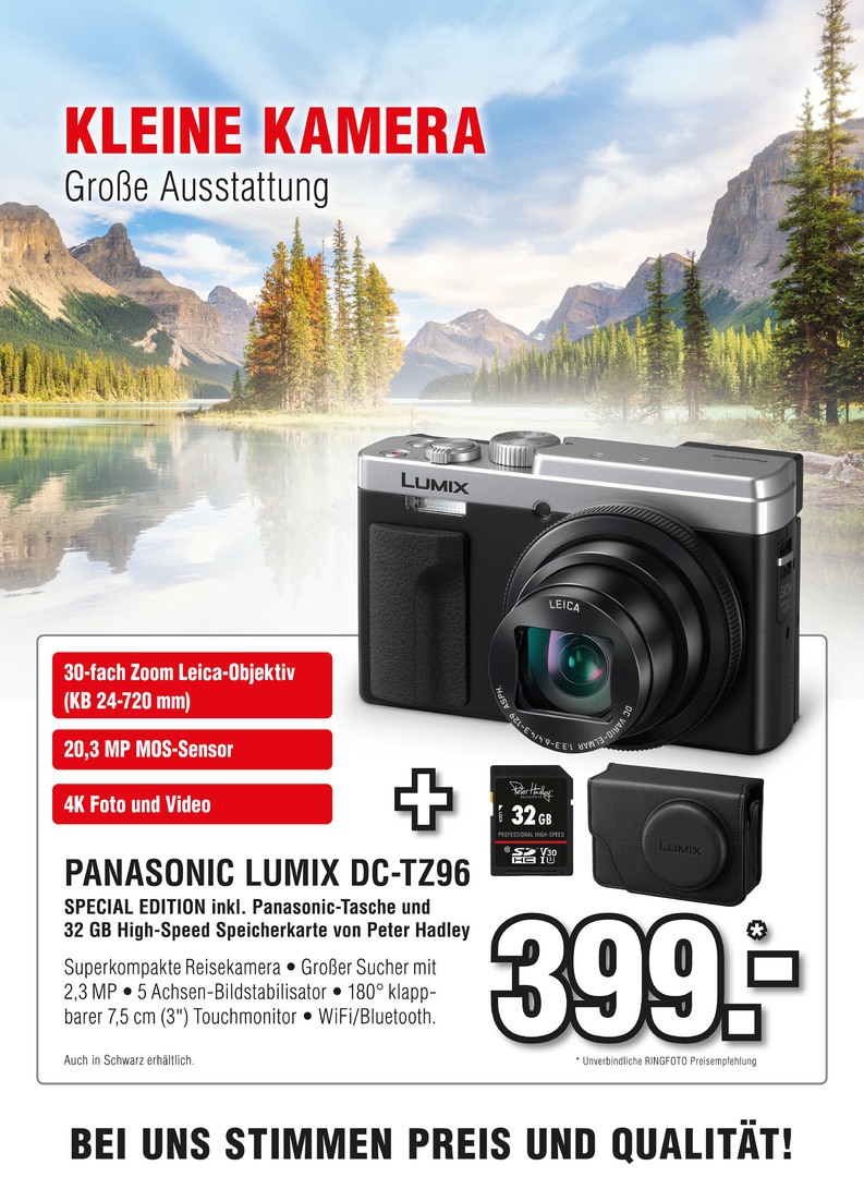 Im Gehäuse der TZ96 steckt ein leistungsstarkes 30x LEICA-Zoom (24-720mm) mit 5-Achsen-Bildstabilisierung und 20 MP Auflösung für nahezu jedes Motiv. Mit ihrer innovativen 4K-Funktion -inklusive 4K-Foto, Post-Focus, Focus-Stacking und Sequence Shot- fangen Fotografen denkbar einfach exakt das Bild ein, das ihnen vorschwebt. Die TZ96 bietet einen größeren und höher auflösenden Sucher als das Schwestermodell TZ91. Ein 180grad Klapp-Touchmonitor dient für bequeme Bodenperspektiven, Selfies mit Retusche-Funktionen oder Aufnahmen für den eigenen 4K-Video-Blog.Für hochpräzise und blitzschnelle Fokussierung sorgt der integrierte Hybrid-Kontrast-Autofokus durch DFD-Technologie, der sich besonders bei größerer Brennweite positiv bemerkbar macht. Über das integrierte WiFi-Modul inklusive stromsparender Bluetooth LE-Verbindung bietet die Kamera ein flexibles Aufnahmeerlebnis, zu dem auch die Fernsteuerung per Smartphone gehört. Schließlich runden ein Multifunktionsring am Objektiv und die Aufnahme im RAW-Format die umfangreiche Ausstattung des Allrounders ab.