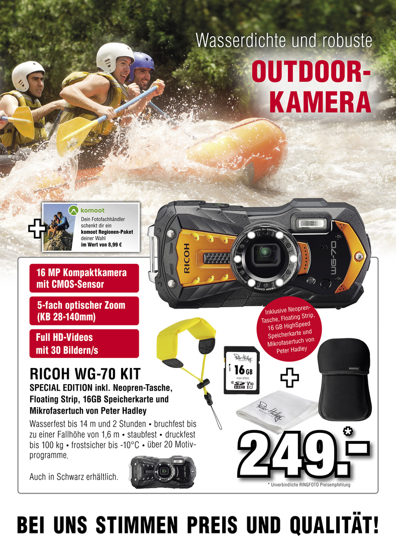 Set mit Ricoh Floating Strap, Neopren Case, Peter Hadley 16GB SD-Karte und Microfasertuch, 16 MP, 5x opt. Zoom (entspr. KB 28-140 mm), erweiterter Unterwasser-Modus (bis 14 m Tiefe), 6 Makro-LED's, Full-HD Video, digitaler 3fach Stabilisator