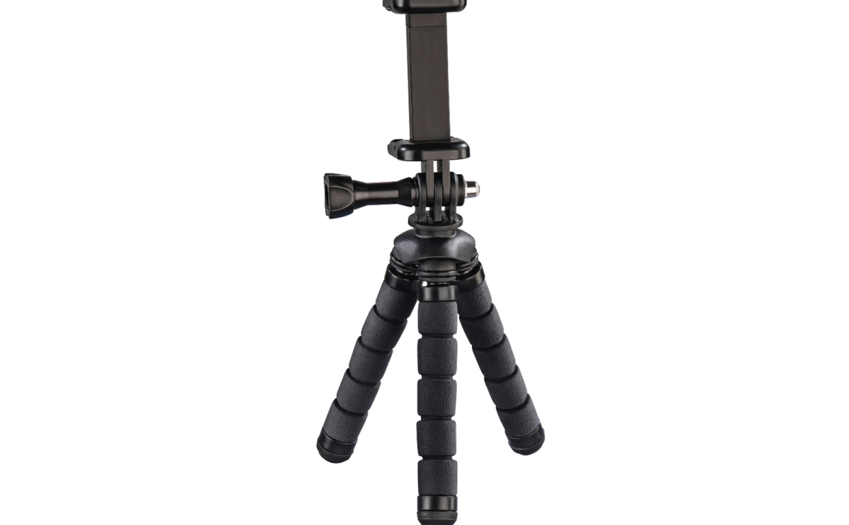 Flexible Beine mit 360°-Biegung zur optimalen und sicheren Positionierung an div. Gegenständen, z.B. Geländer, Äste, 2in1-Biegestativ für Smartphones und GoPro-Kameras.